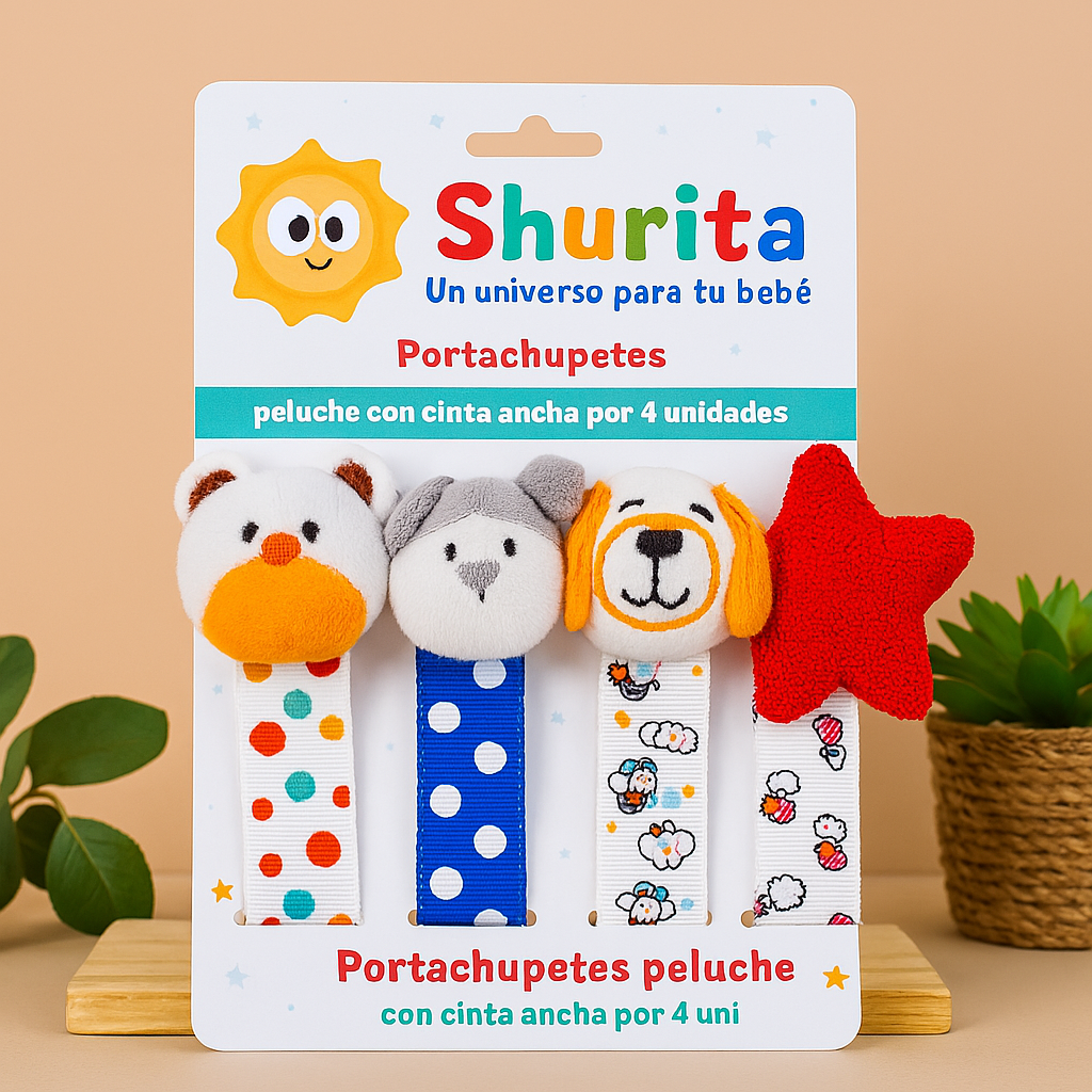 Portachupete ancha con prendedor peluche por 4 unidades