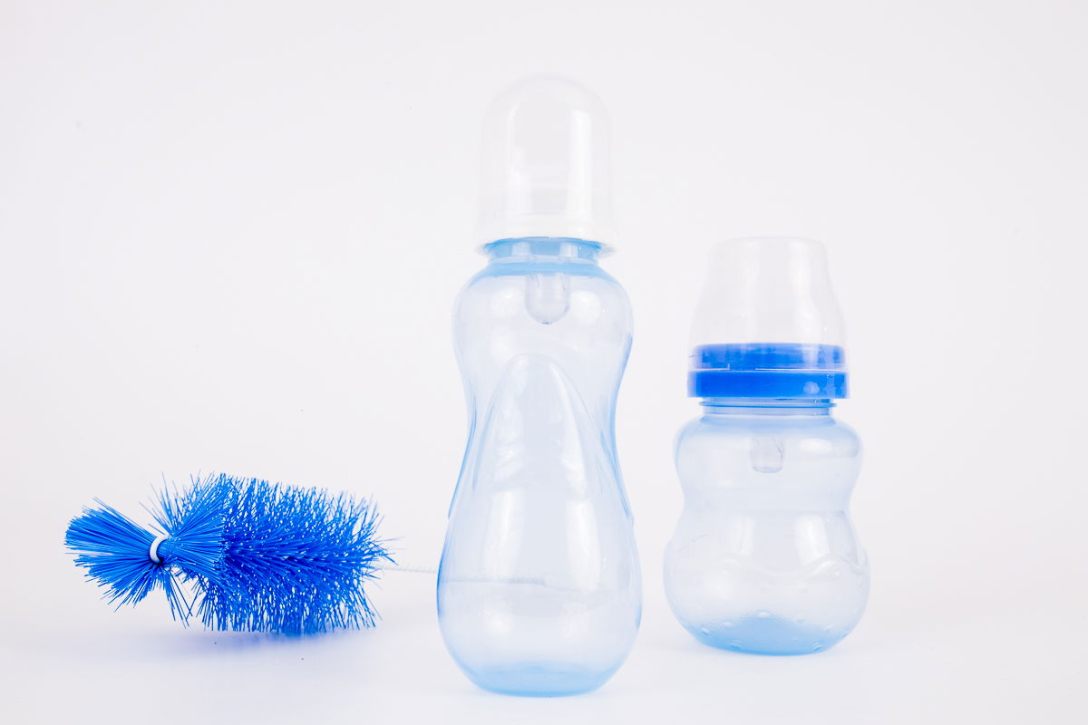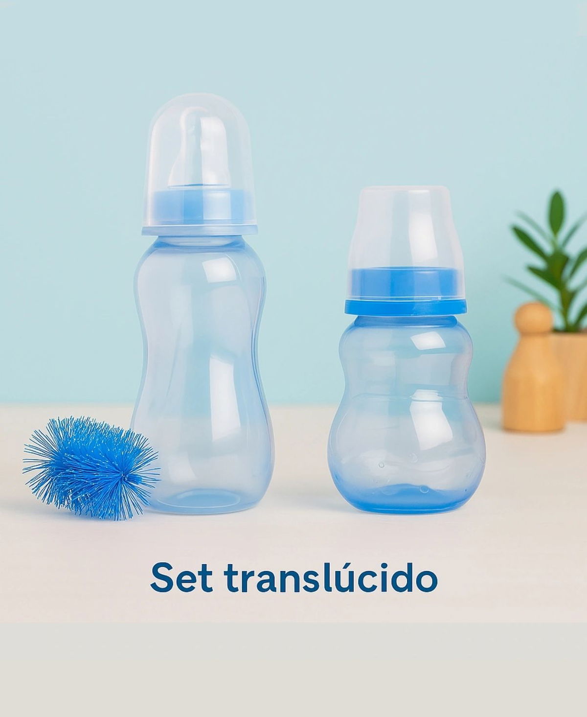 Mamadera pepona, mamadera translúcida y limpiamamadera.